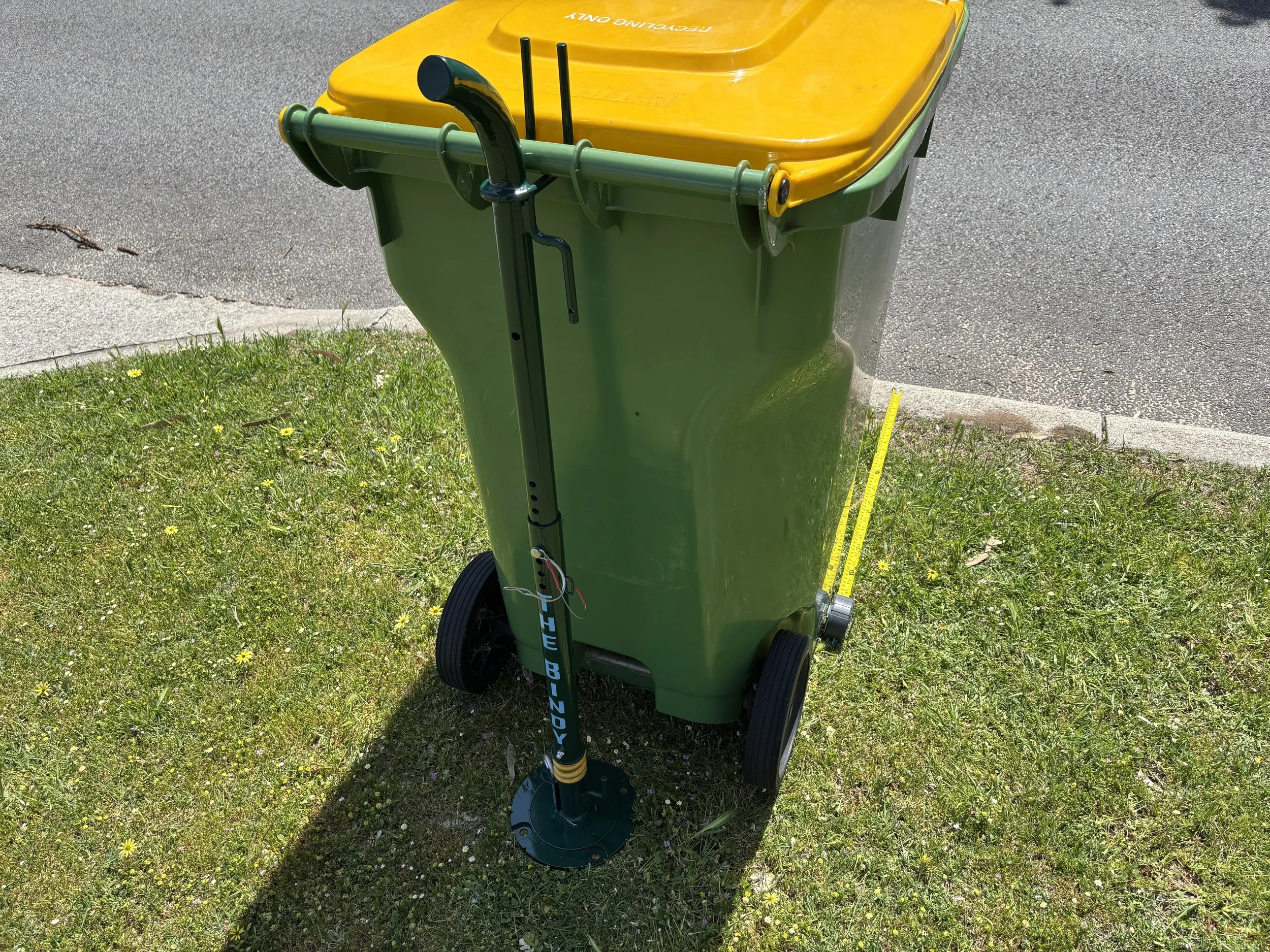 Bindy is a simple yet clever solution designed to stop wheelie bins from tipping over in strong winds. It is a removeable & reusable stand that locks into place with a simple twist. Bindy allows the rubbish truck to simply lift the bin off with no interference during collection. No more rubbish blowing across your street, no more chasing bins down the road, no more missed collection days - Bindy keeps your bin safe & upright until collection.